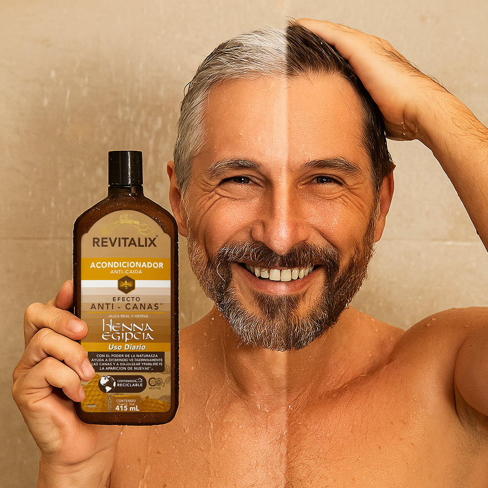 Recupera la vitalidad y el color natural de tu cabello con Combo DUO Revitalix®: shampoo y acondicionador que nutren, revitalizan y reducen visiblemente las canas en cada lavado.